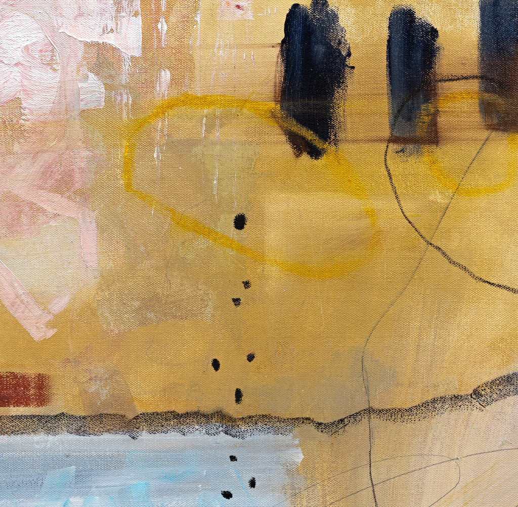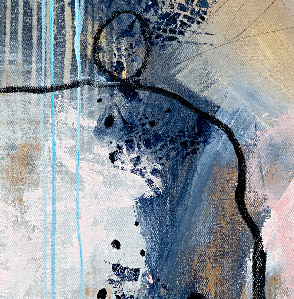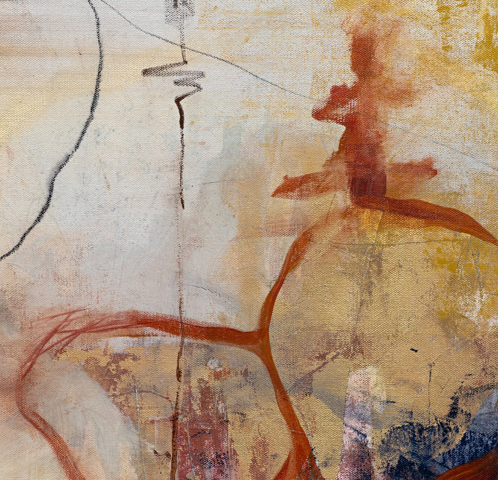 "Centre Stage" captures the tension and beauty of emergence. Layers of red, gold, and blue evoke both vulnerability and power, reflecting the act of stepping fully into visibility.