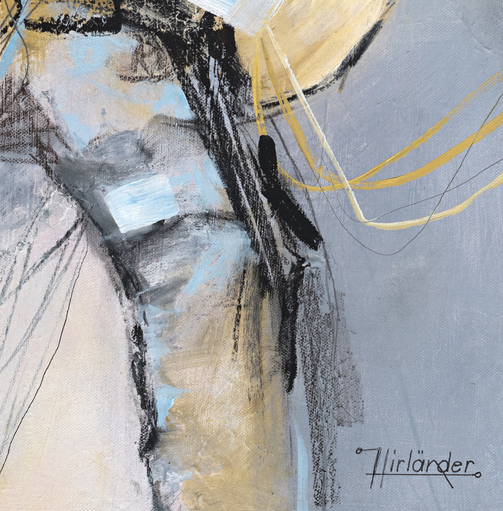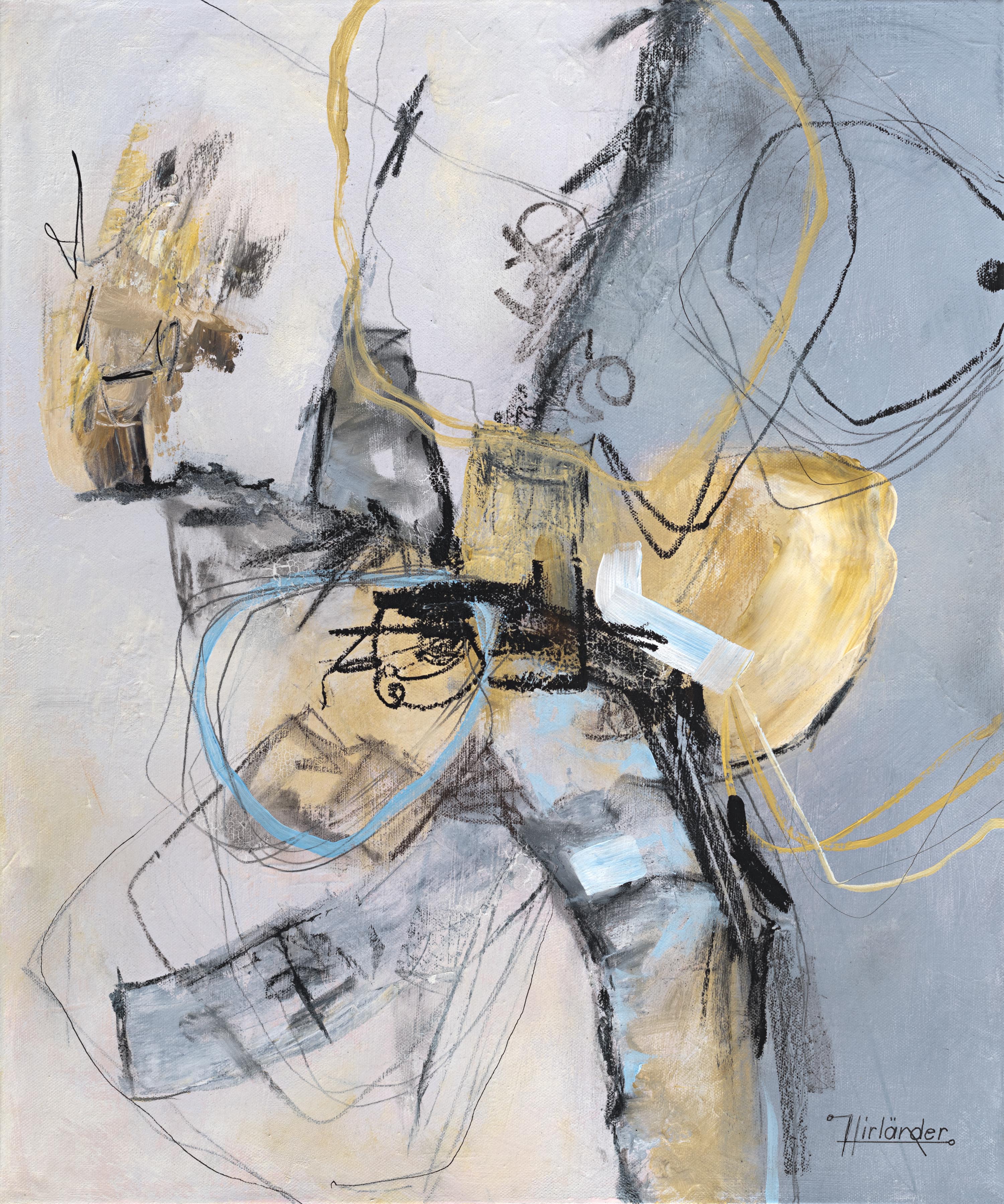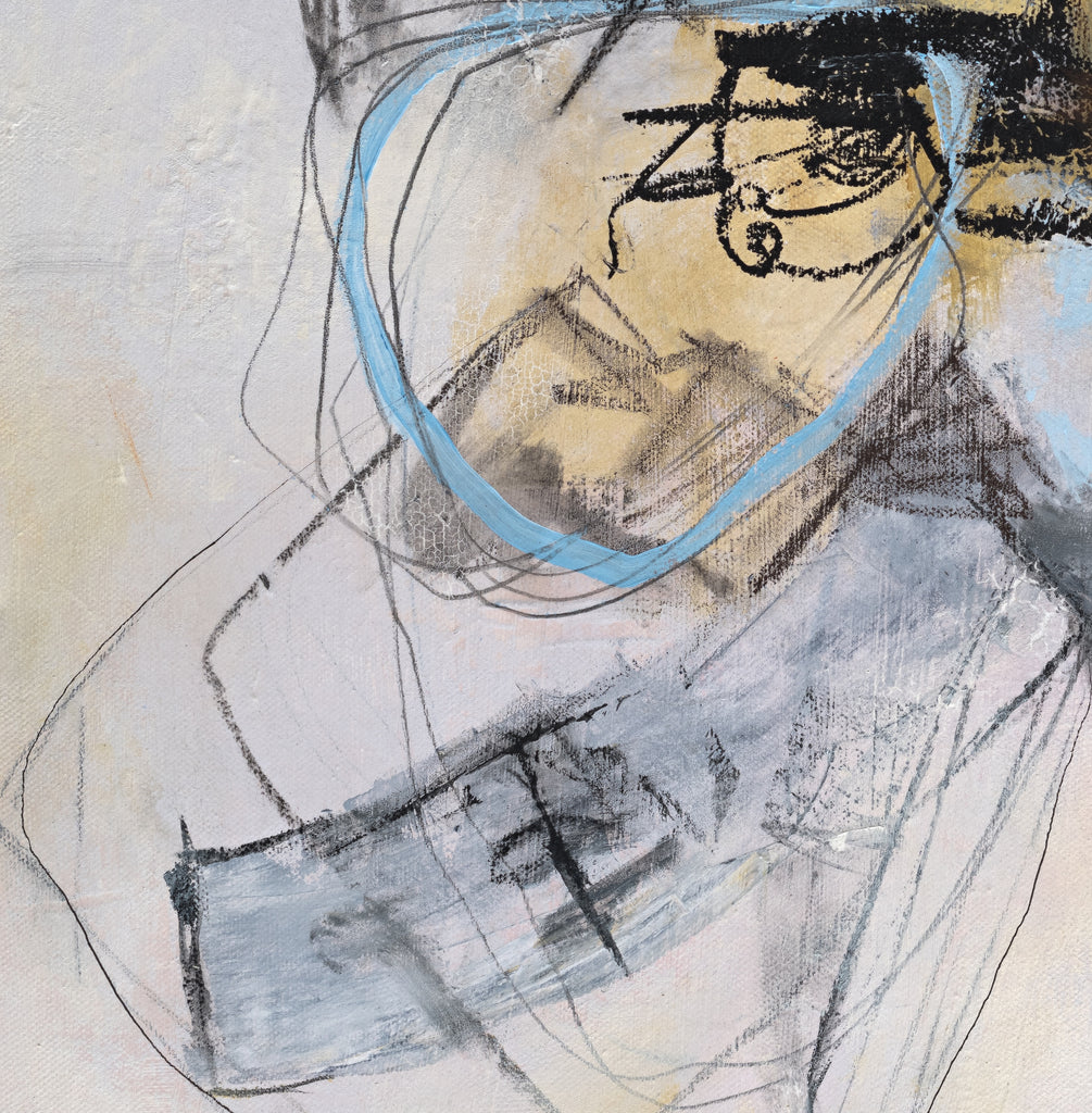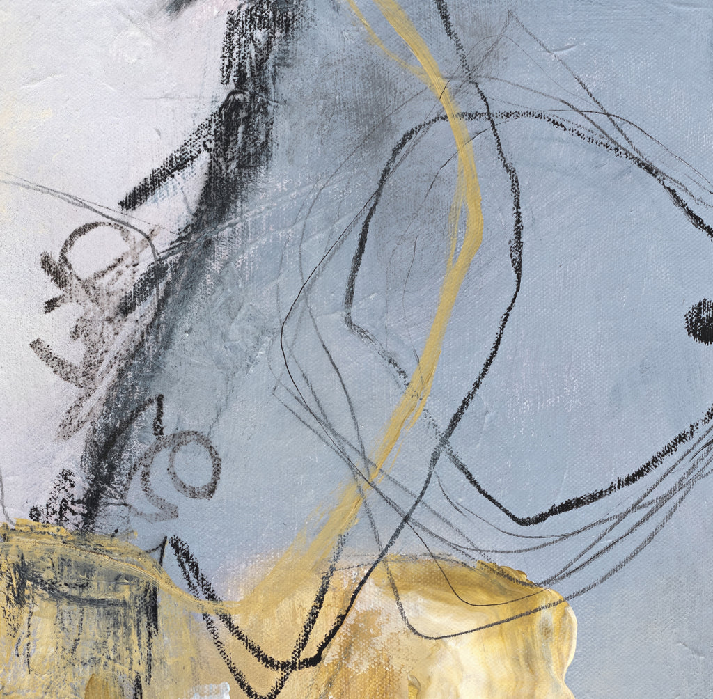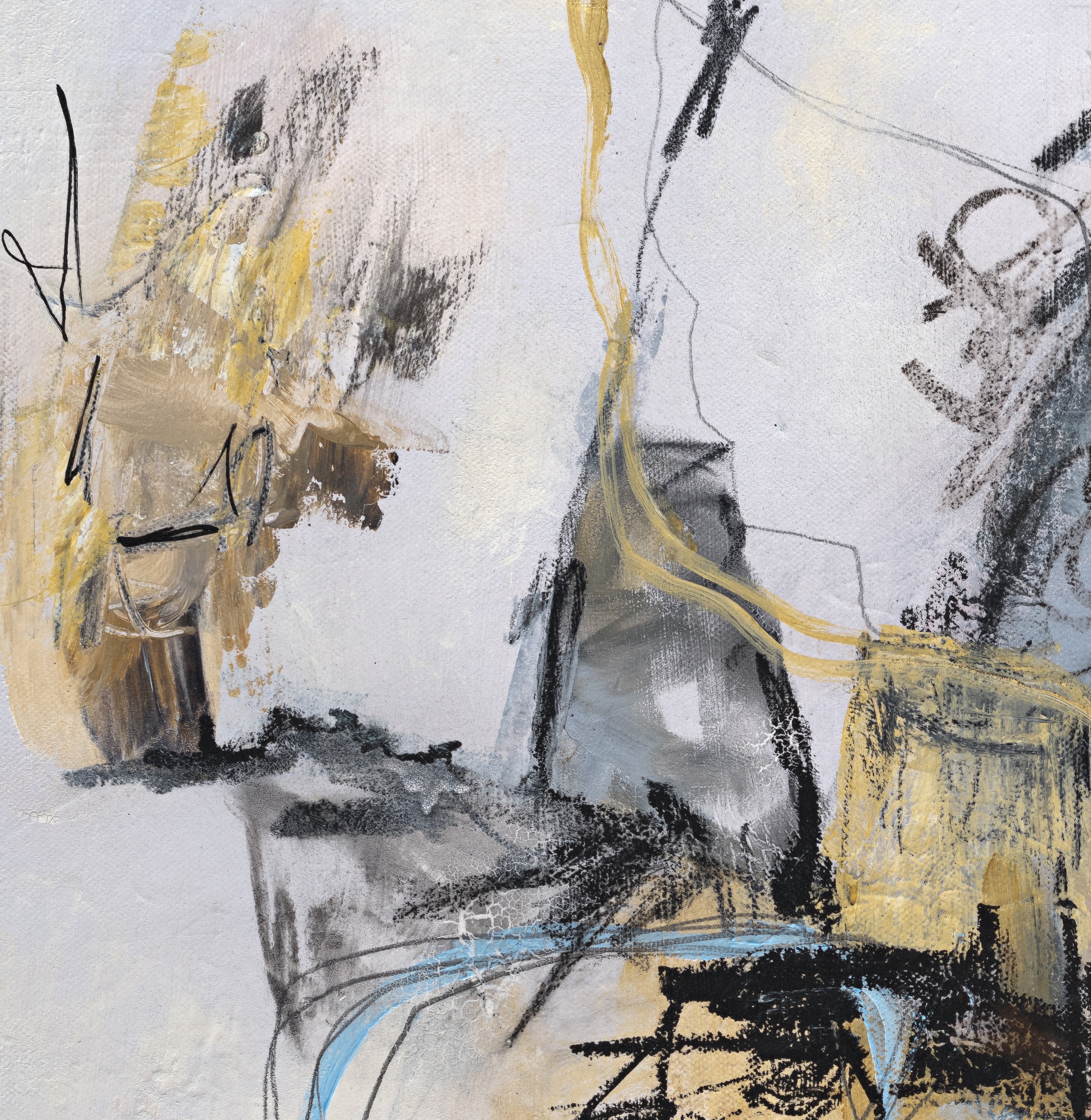 "Fault Line" reflects the fractures both visible and hidden that shape landscapes and lives. Strong black lines cut through muted layers of grey, gold, and blue, embodying disruption and transformation. The piece invites reflection on resilience and the unexpected beauty that emerges when fault lines open new paths of expression.