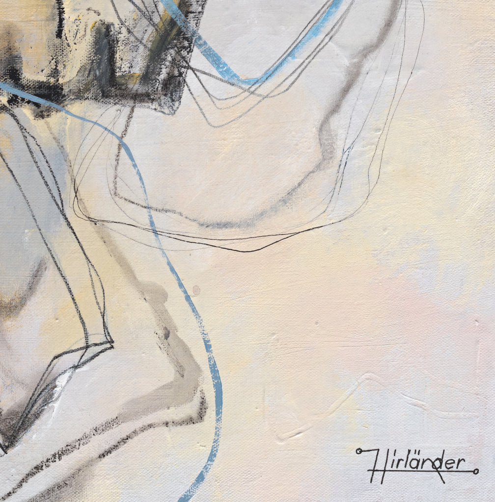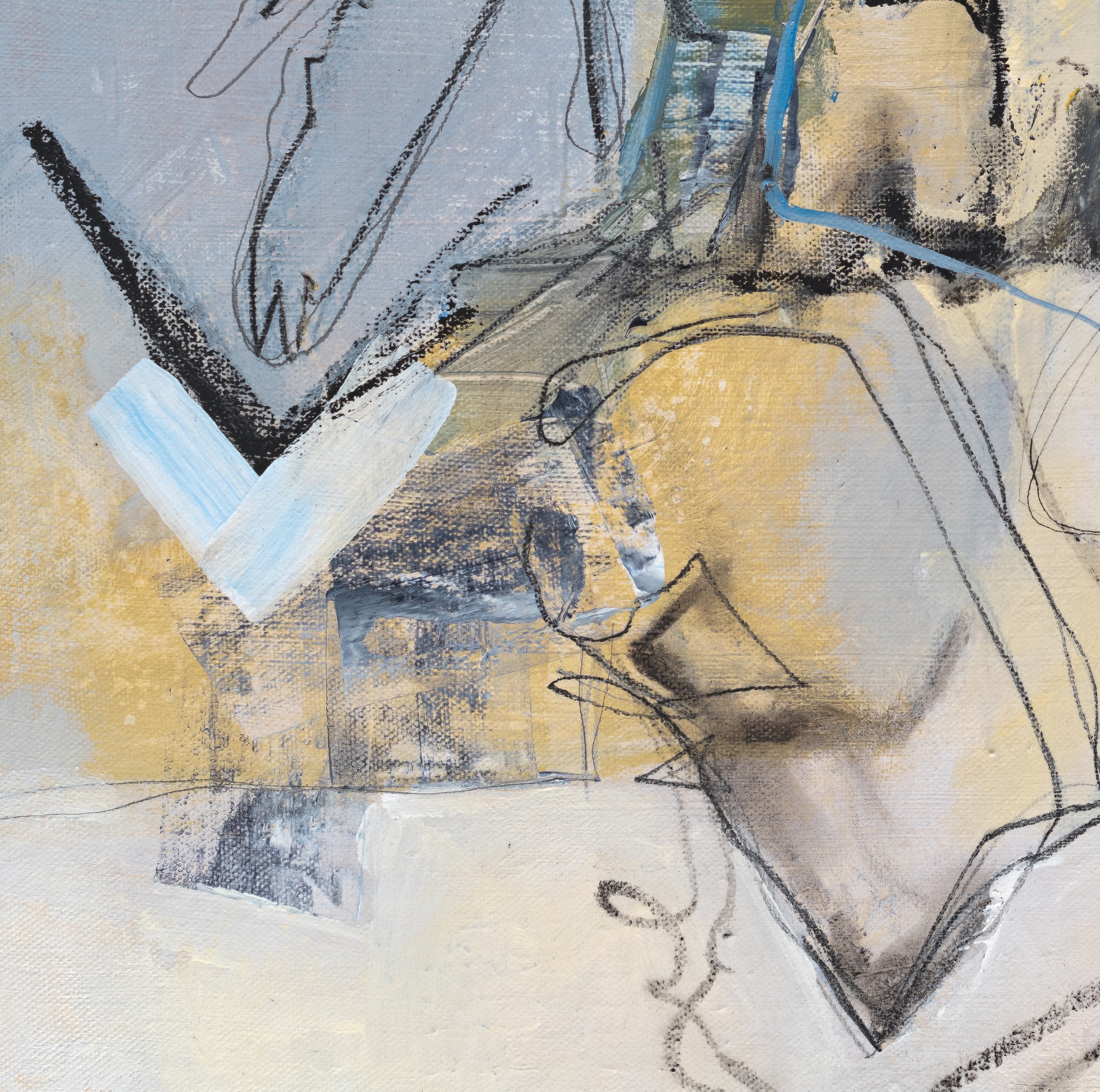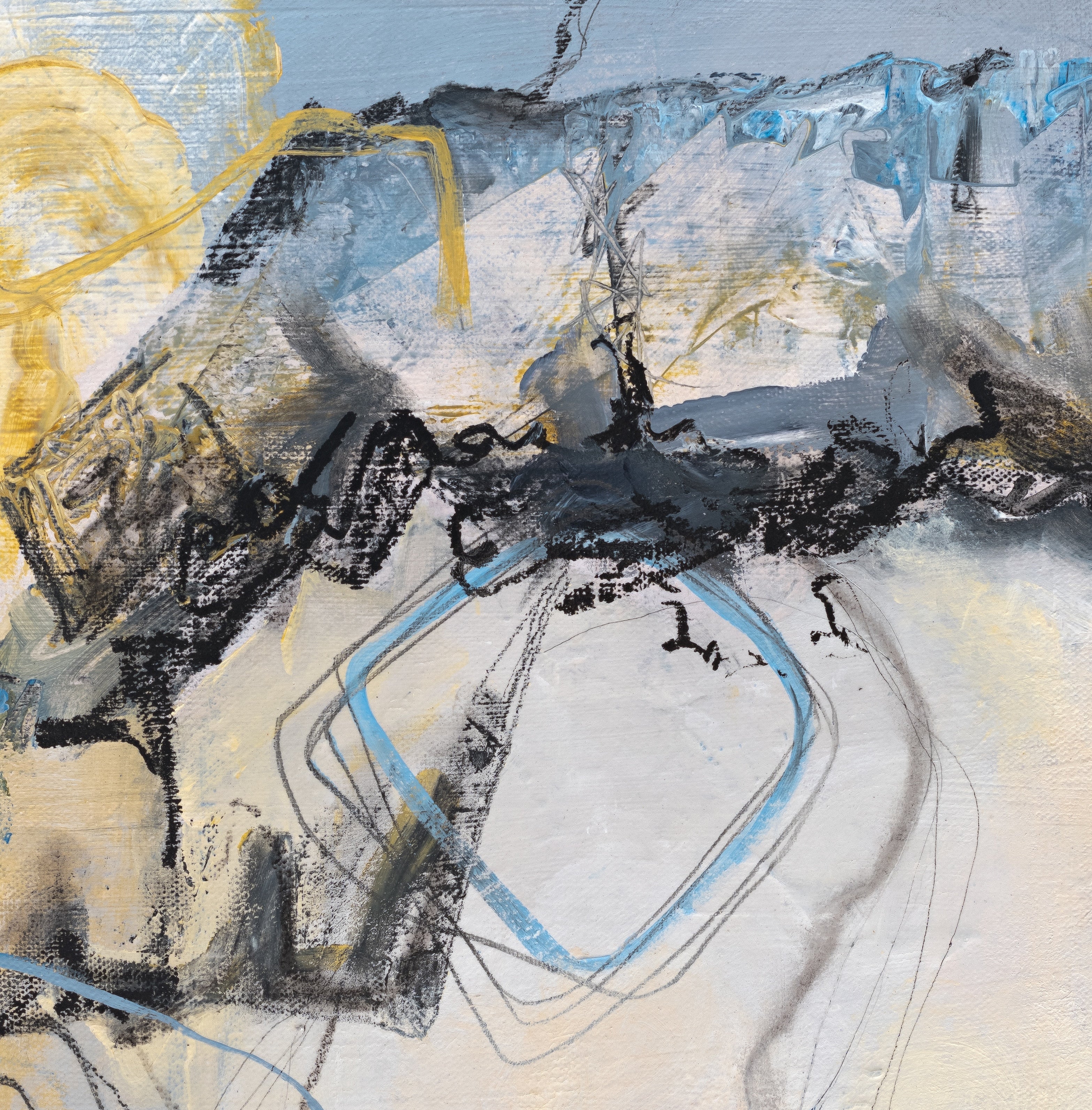 "Signal in the Static" explores clarity within chaos. Black lines and layered tones of blue, gold, and neutral hues suggest fleeting moments of connection rising through noise. The work reflects on how subtle signals guide us through uncertainty and back into resonance.