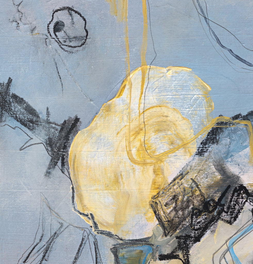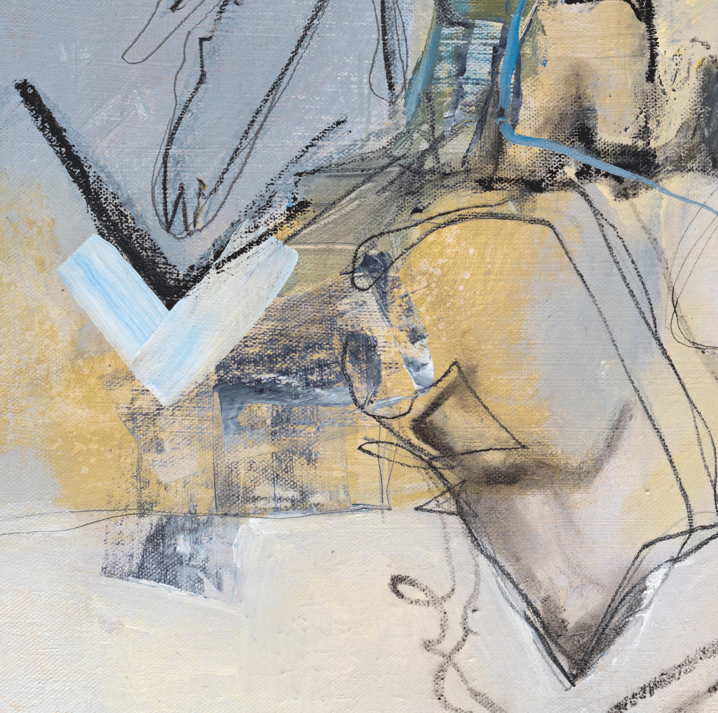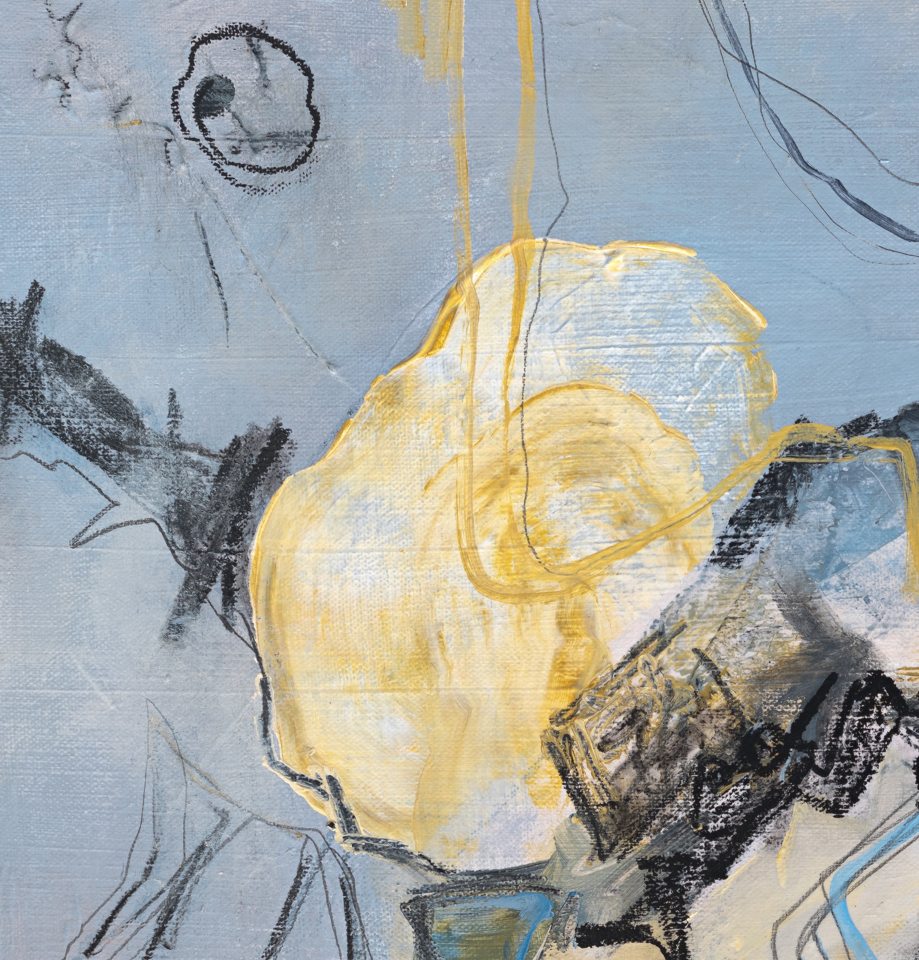 "Signal in the Static" explores clarity within chaos. Black lines and layered tones of blue, gold, and neutral hues suggest fleeting moments of connection rising through noise. The work reflects on how subtle signals guide us through uncertainty and back into resonance.