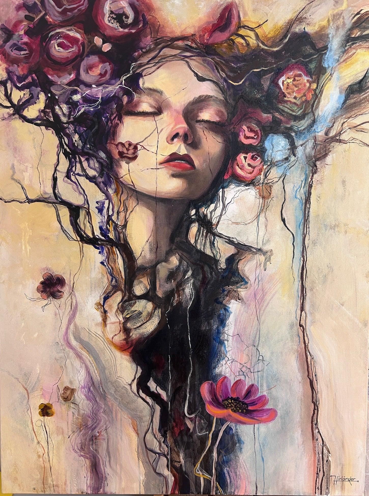The portrait blends expressive marks with organic, abstract shapes to create a piece that feels awake and inward-facing. Soft earth tones, touches of pink and violet, and layered textures build an atmosphere of warmth and subtle transformation.